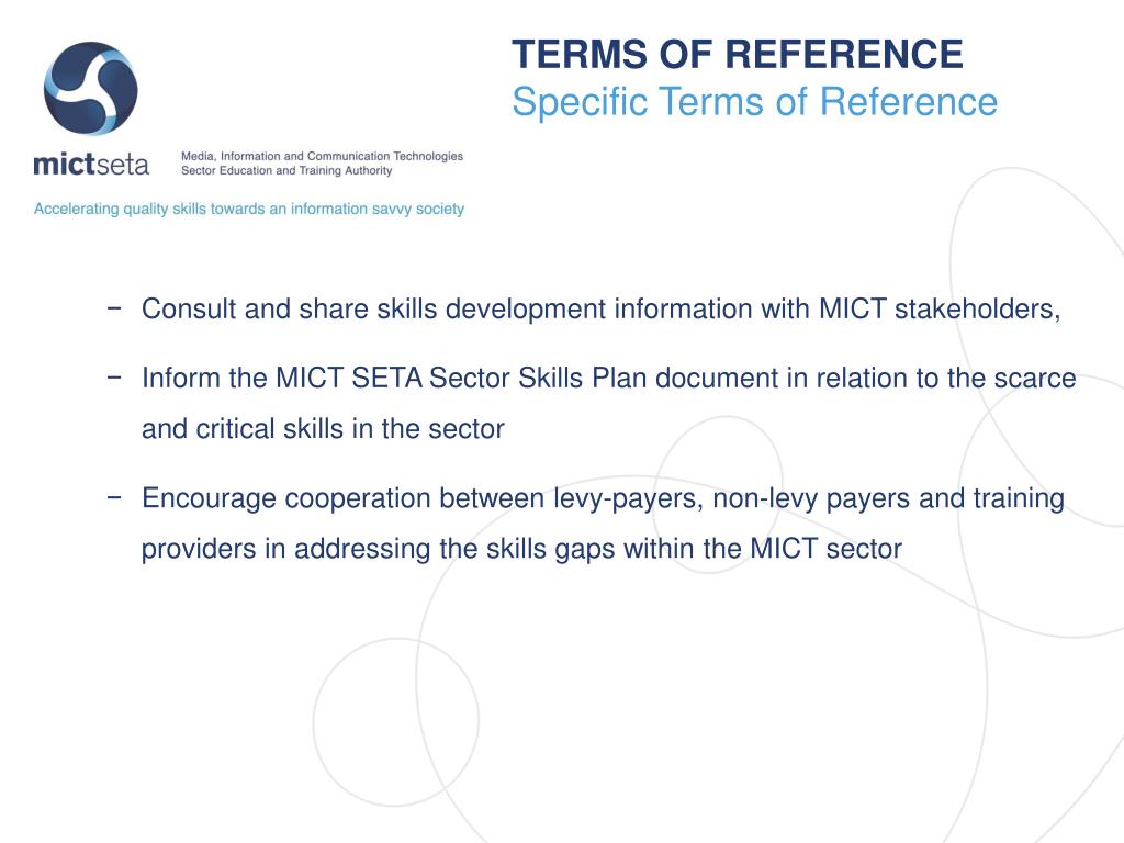 TERMS OF REFERENCESpecific Terms of Reference • Consult and share skills development information with MICT stakeholders, • Inform the MICT SETA Sector Skills Plan document in relation to the scarce and critical skills in the sector • Encourage cooperation between levy-payers, non-levy payers and training providers in addressing the skills gaps within the MICT sector