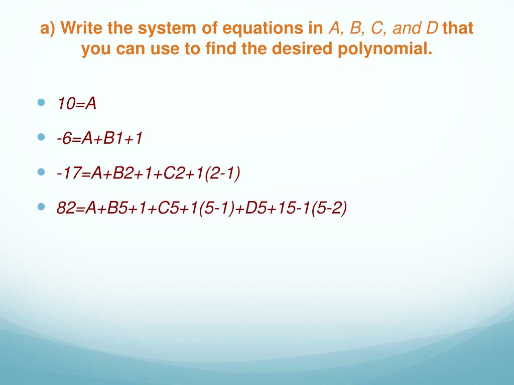 a) Write the system of equations in A, B, C, andDthat you can use to find the desired polynomial. • 10=A • -6=A+B1+1 • -17=A+B2+1+C2+1(2-1) • 82=A+B5+1+C5+1(5-1)+D5+15-1(5-2)