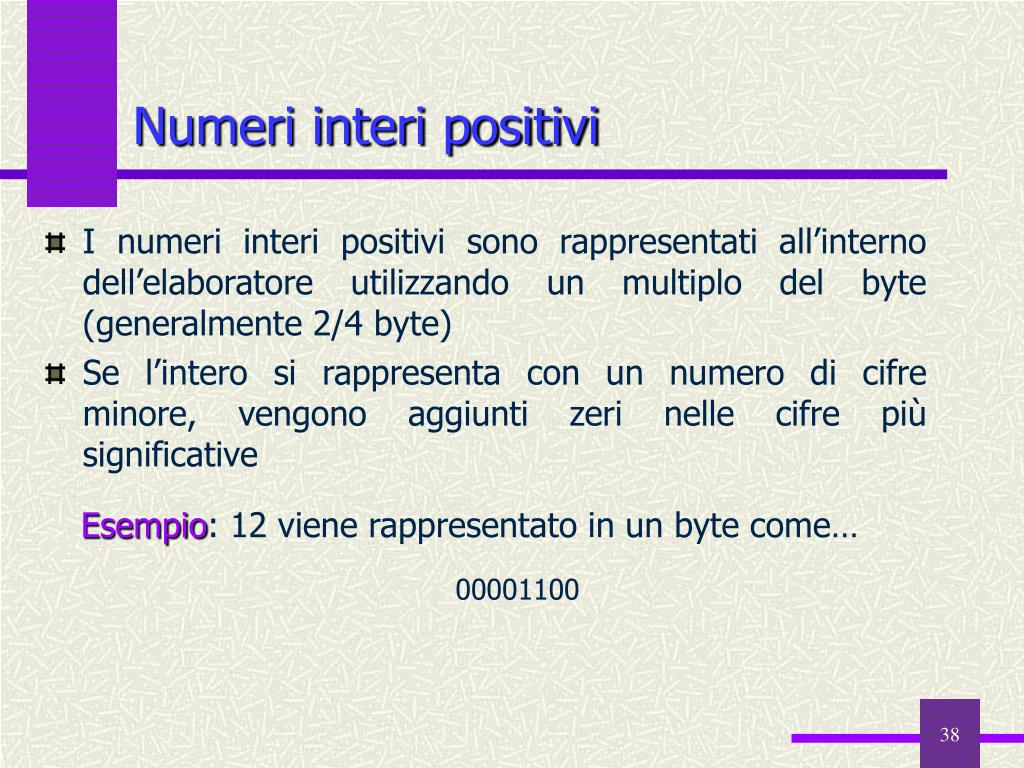 Numeri interi positivi • I numeri interi positivi sono rappresentati all’interno dell’elaboratore utilizzando un multiplo del byte (generalmente 2/4 byte) • Se l’intero si rappresenta con un numero di cifre minore, vengono aggiunti zeri nelle cifre più significative Esempio: 12 viene rappresentato in un byte come… 00001100