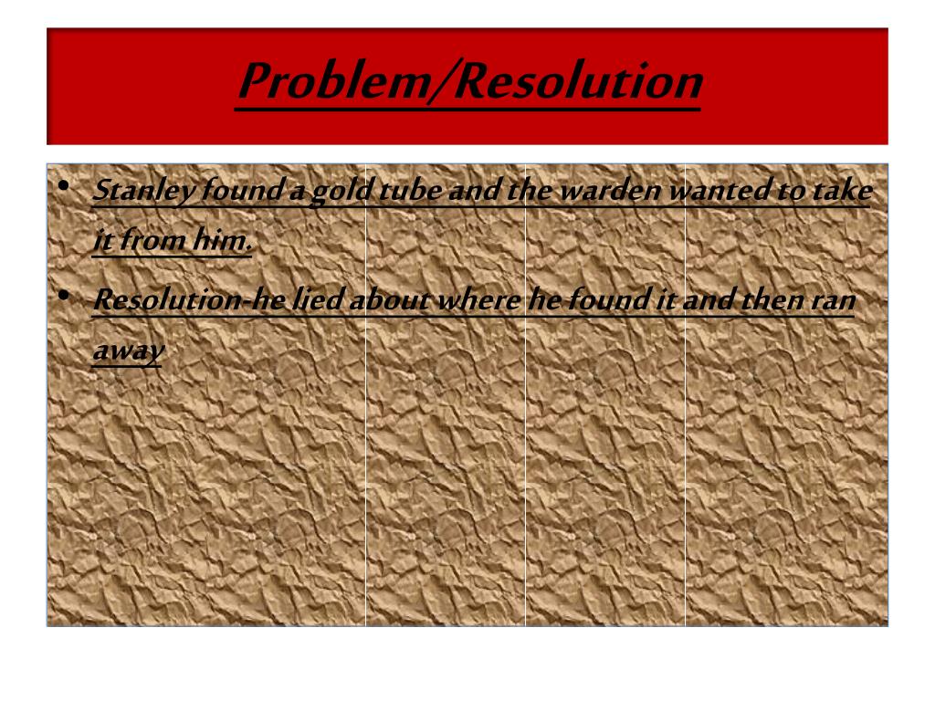 Problem/Resolution • Stanley found a gold tube and the warden wanted to take it from him. • Resolution-he lied about where he found it and then ran away