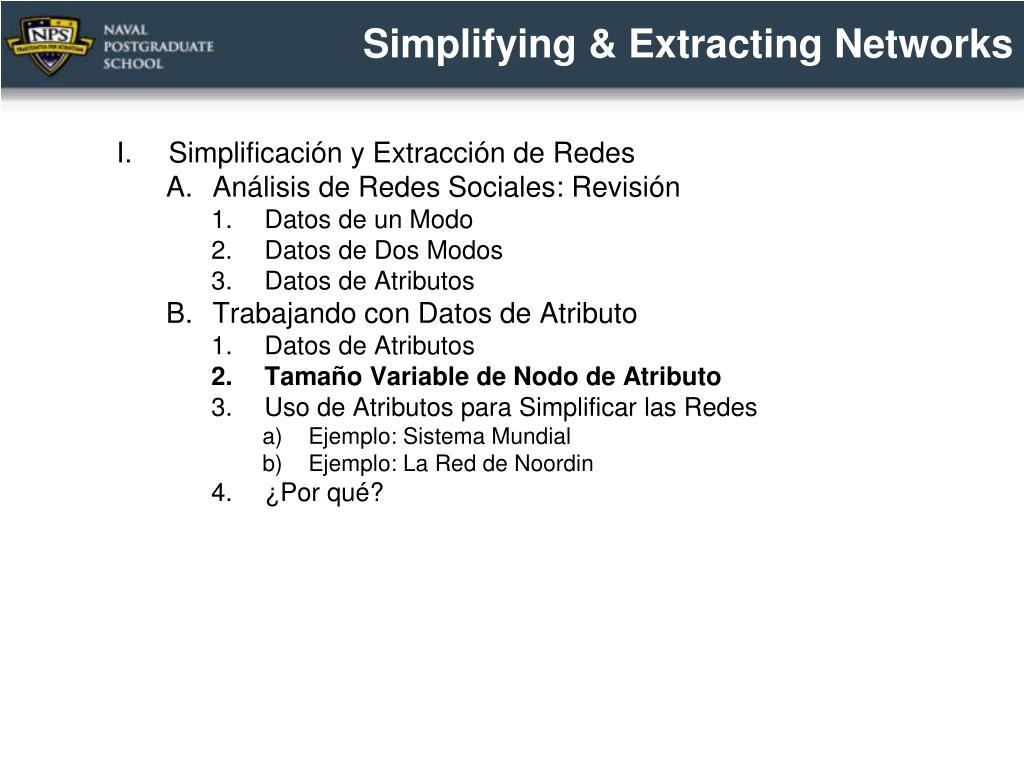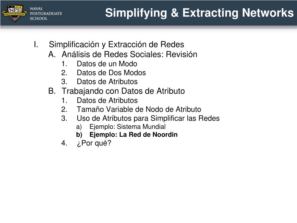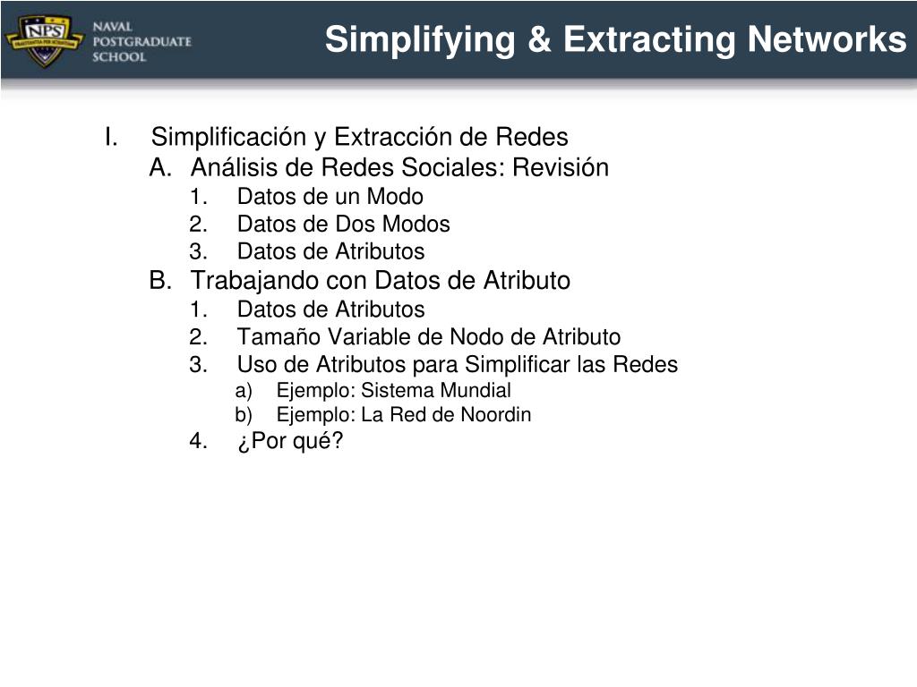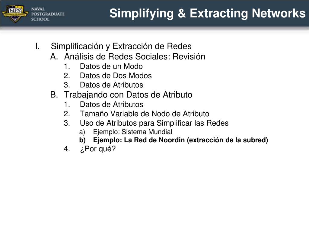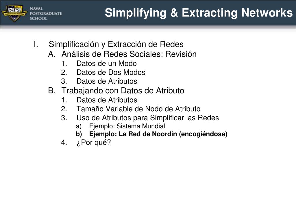 Simplifying & Extracting Networks • Simplificación y Extracción de Redes • Análisis de Redes Sociales: Revisión • Datos de un Modo • Datos de Dos Modos • Datos de Atributos • Trabajando con Datos de Atributo • Datos de Atributos • Tamaño Variable de Nodo de Atributo • Uso de Atributos para Simplificar las Redes • Ejemplo: Sistema Mundial • Ejemplo: La Red de Noordin (extracción de la subred) • ¿Por qué?