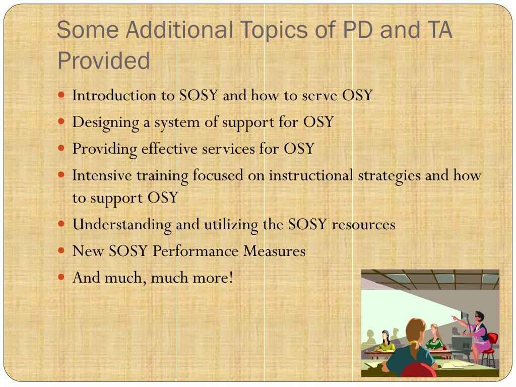 Some Additional Topics of PD and TA Provided • Introduction to SOSY and how to serve OSY • Designing a system of support for OSY • Providing effective services for OSY • Intensive training focused on instructional strategies and how to support OSY • Understanding and utilizing the SOSY resources • New SOSY Performance Measures • And much, much more!
