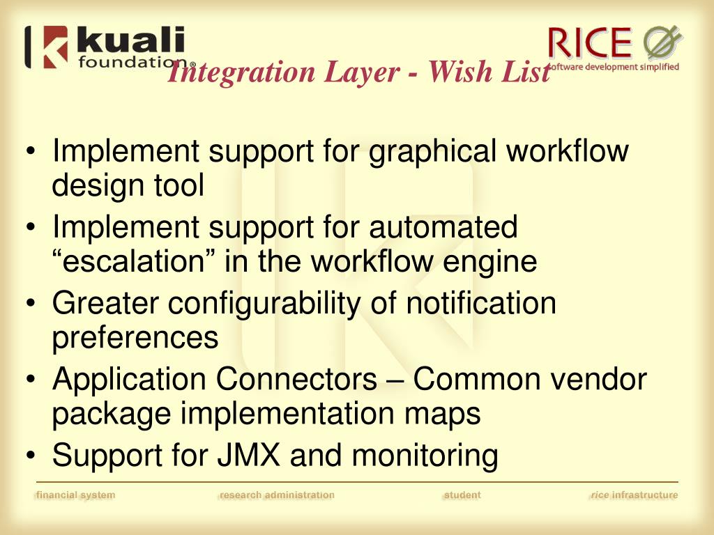 Integration Layer - Wish List • Implement support for graphical workflow design tool • Implement support for automated “escalation” in the workflow engine • Greater configurability of notification preferences • Application Connectors – Common vendor package implementation maps • Support for JMX and monitoring