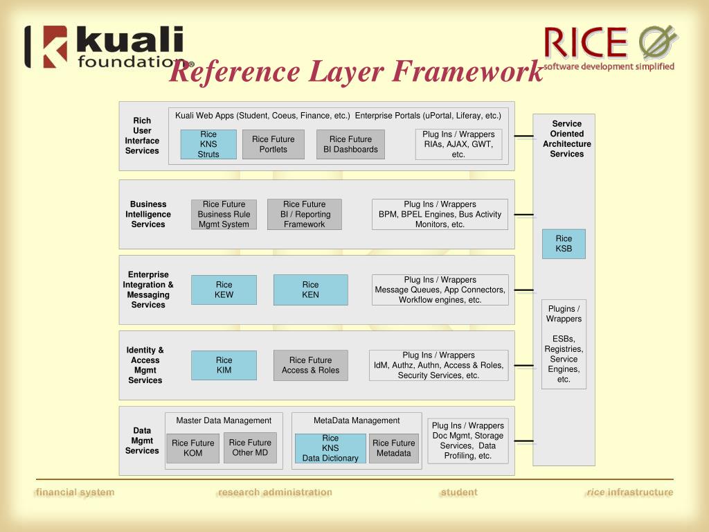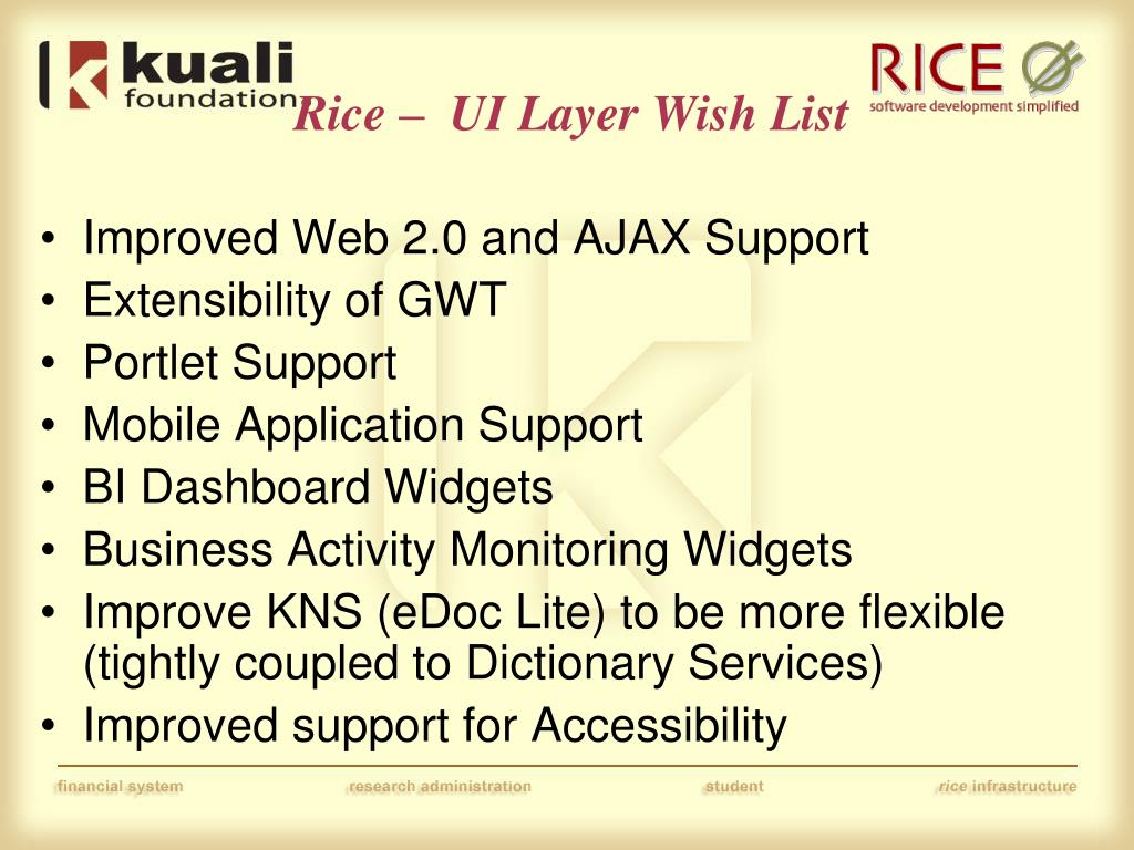 Rice – UI Layer Wish List • Improved Web 2.0 and AJAX Support • Extensibility of GWT • Portlet Support • Mobile Application Support • BI Dashboard Widgets • Business Activity Monitoring Widgets • Improve KNS (eDocLite) to be more flexible (tightly coupled to Dictionary Services) • Improved support for Accessibility