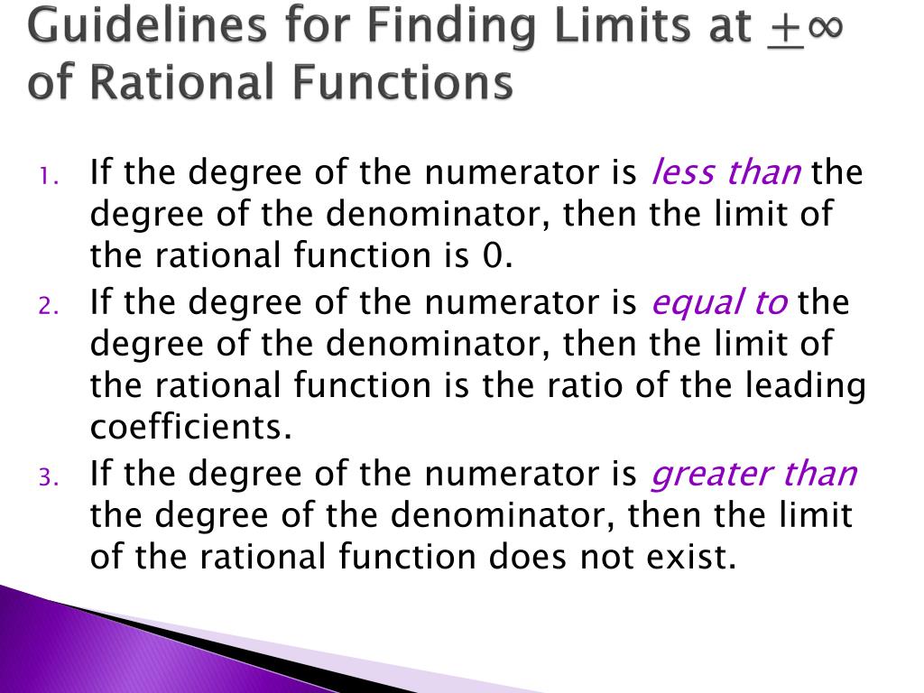 Guidelines for Finding Limits at +∞ of Rational Functions • If the degree of the numerator is less than the degree of the denominator, then the limit of the rational function is 0. • If the degree of the numerator is equal to the degree of the denominator, then the limit of the rational function is the ratio of the leading coefficients. • If the degree of the numerator is greater than the degree of the denominator, then the limit of the rational function does not exist.