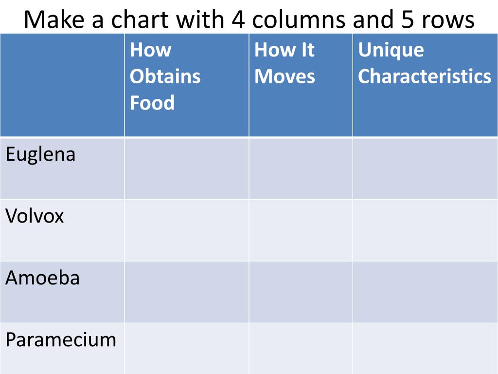 Euglena 1. How the organism obtains food: Photosynthetic Autotroph& Heterotrophic 2. How the organism moves: by flagella 3. Any unique characteristics pigment spot (or stigma), positive phototaxis