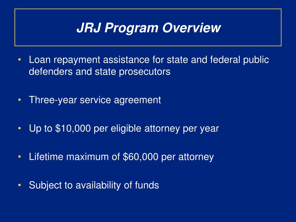 JRJ Program Overview • Loan repayment assistance for state and federal public defenders and state prosecutors • Three-year service agreement • Up to $10,000 per eligible attorney per year • Lifetime maximum of $60,000 per attorney • Subject to availability of funds