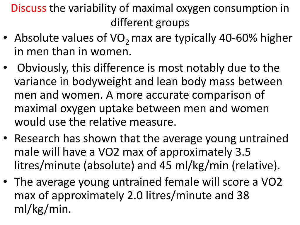 Discuss the variability of maximal oxygen consumption in different groups • Absolute values of VO2 max are typically 40-60% higher in men than in women. • Obviously, this difference is most notably due to the variance in bodyweight and lean body mass between men and women. A more accurate comparison of maximal oxygen uptake between men and women would use the relative measure. • Research has shown that the average young untrained male will have a VO2 max of approximately 3.5 litres/minute (absolute) and 45 ml/kg/min (relative). • The average young untrained female will score a VO2 max of approximately 2.0 litres/minute and 38 ml/kg/min.