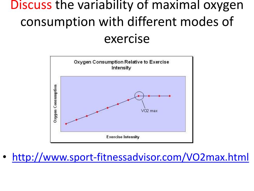 Discuss the variability of maximal oxygen consumption with different modes of exercise • http://www.sport-fitnessadvisor.com/VO2max.html