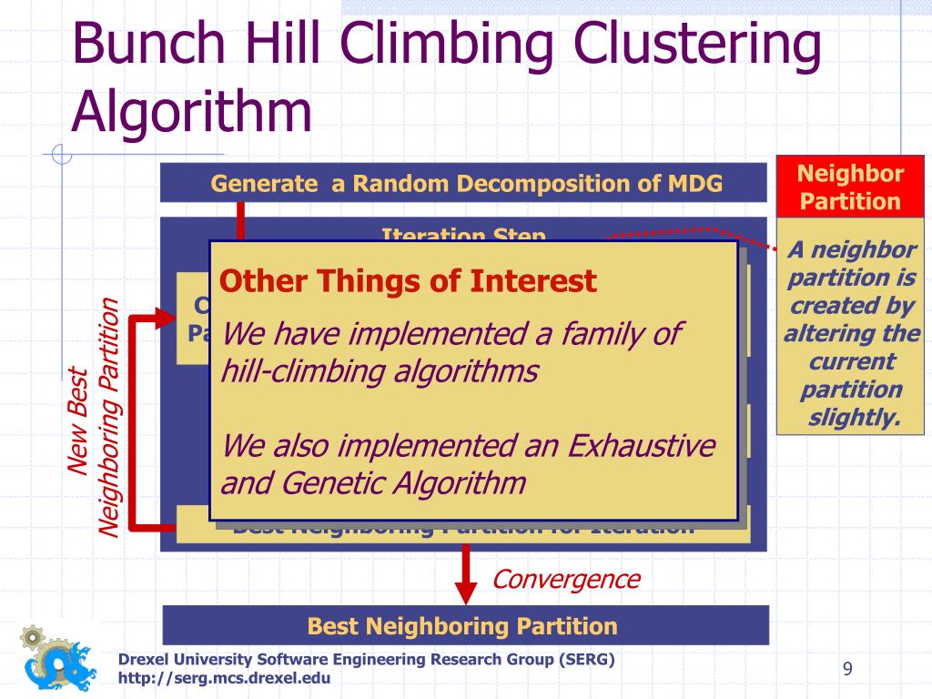 Neighbor Partition A neighborpartition iscreated byaltering thecurrentpartition slightly. Generate Next Neighbor Measure MQ Current Partition Measure MQ New Best Neighboring Partition Compare to Best Neighboring Partition Better Better? Best Neighboring Partition for Iteration Convergence Best Neighboring Partition Bunch Hill Climbing Clustering Algorithm Generate a Random Decomposition of MDG Iteration Step Other Things of Interest We have implemented a family ofhill-climbing algorithms We also implemented an Exhaustiveand Genetic Algorithm