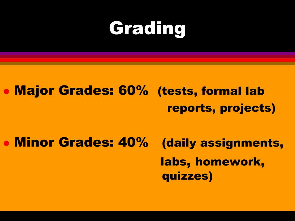Grading • Major Grades: 60% (tests, formal lab reports, projects) • Minor Grades: 40% (daily assignments, labs, homework, quizzes)