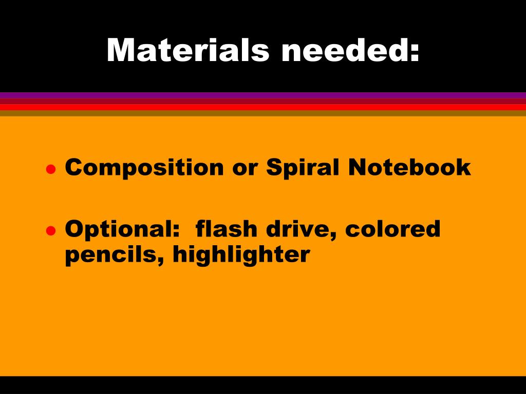 Materials needed: • Composition or Spiral Notebook • Optional: flash drive, colored pencils, highlighter