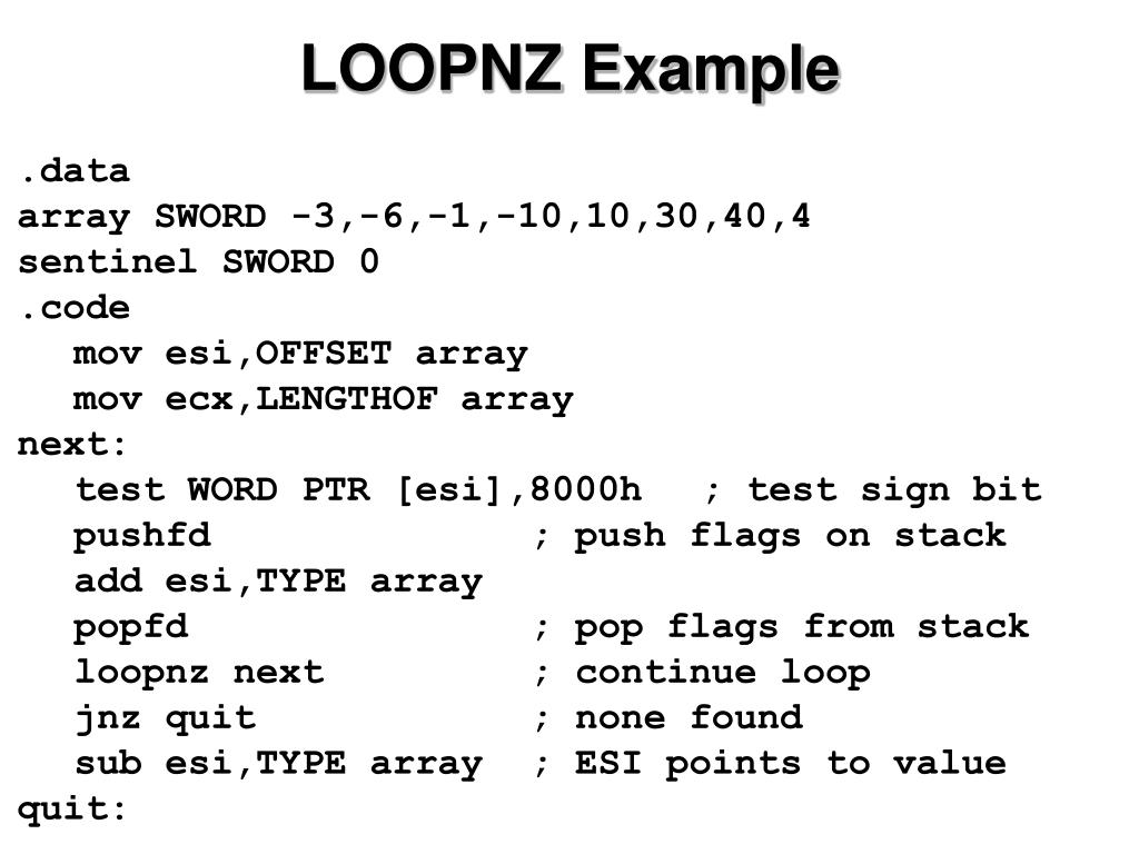 LOOPNZ Example The following code finds the first positive value in an array: • .data • array SWORD -3,-6,-1,-10,10,30,40,4 • sentinel SWORD 0 • .code • mov esi,OFFSET array • mov ecx,LENGTHOF array • next: • test WORD PTR [esi],8000h ; test sign bit • pushfd ; push flags on stack • add esi,TYPE array • popfd ; pop flags from stack • loopnz next ; continue loop • jnz quit ; none found • sub esi,TYPE array ; ESI points to value • quit: Recall: TYPE returns size in bytes of single element