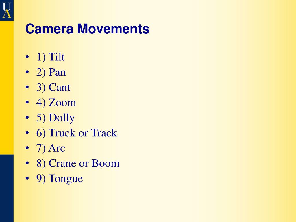 Camera Movements • 1) Tilt • 2) Pan • 3) Cant • 4) Zoom • 5) Dolly • 6) Truck or Track • 7) Arc • 8) Crane or Boom • 9) Tongue