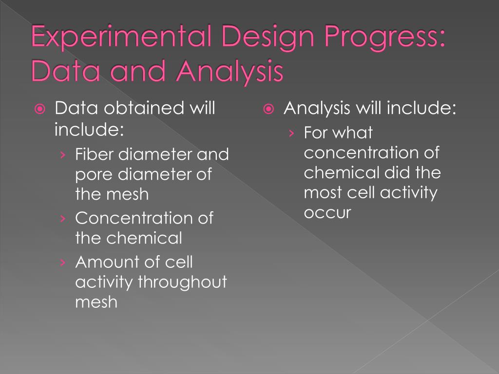 Experimental Design Progress:Data and Analysis • Data obtained will include: • Fiber diameter and pore diameter of the mesh • Concentration of the chemical • Amount of cell activity throughout mesh • Analysis will include: • For what concentration of chemical did the most cell activity occur