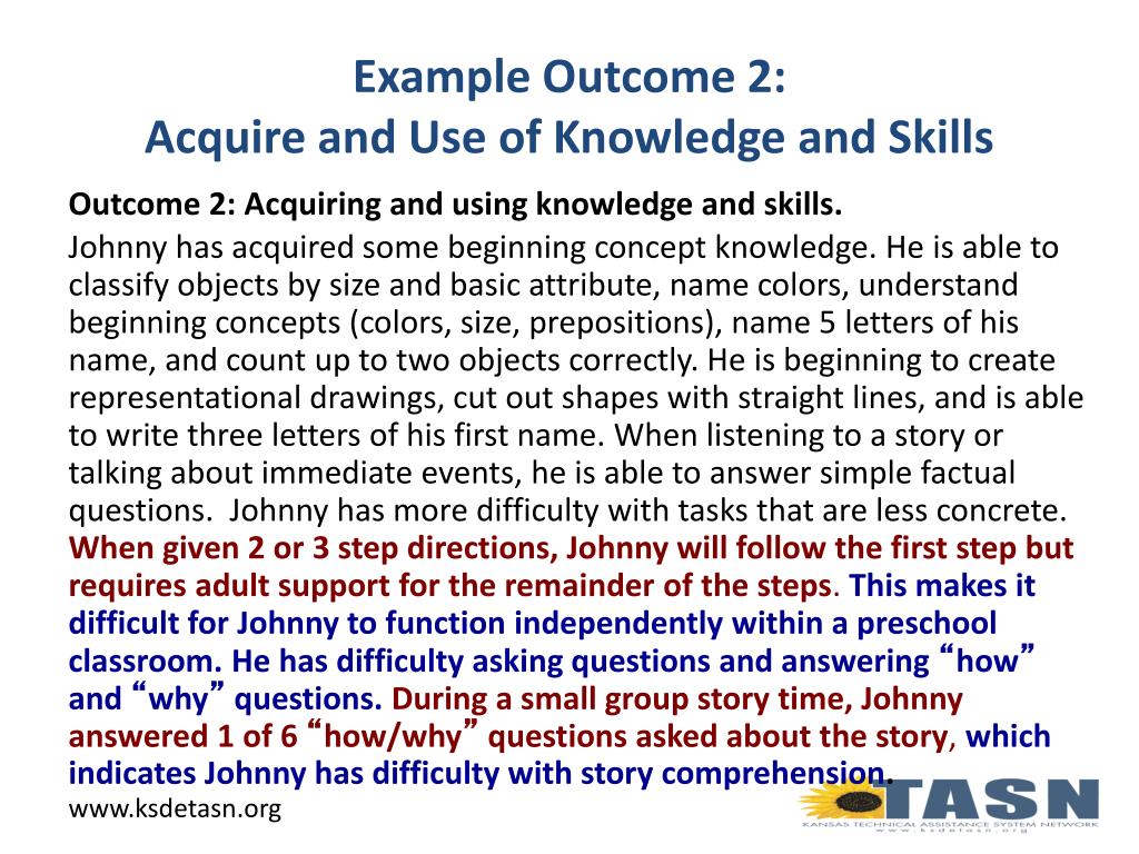 Example Outcome 2:Acquire and Use of Knowledge and Skills www.ksdetasn.org Outcome 2: Acquiring and using knowledge and skills. Johnny has acquired some beginning concept knowledge. He is able to classify objects by size and basic attribute, name colors, understand beginning concepts (colors, size, prepositions), name 5 letters of his name, and count up to two objects correctly. He is beginning to create representational drawings, cut out shapes with straight lines, and is able to write three letters of his first name. When listening to a story or talking about immediate events, he is able to answer simple factual questions. Johnny has more difficulty with tasks that are less concrete. When given 2 or 3 step directions, Johnny will follow the first step but requires adult support for the remainder of the steps.This makes it difficult for Johnny to function independently within a preschool classroom. He has difficulty asking questions and answering “how” and “why” questions. During a small group story time, Johnny answered 1 of 6 “how/why” questions asked about the story, which indicates Johnny has difficulty with story comprehension.