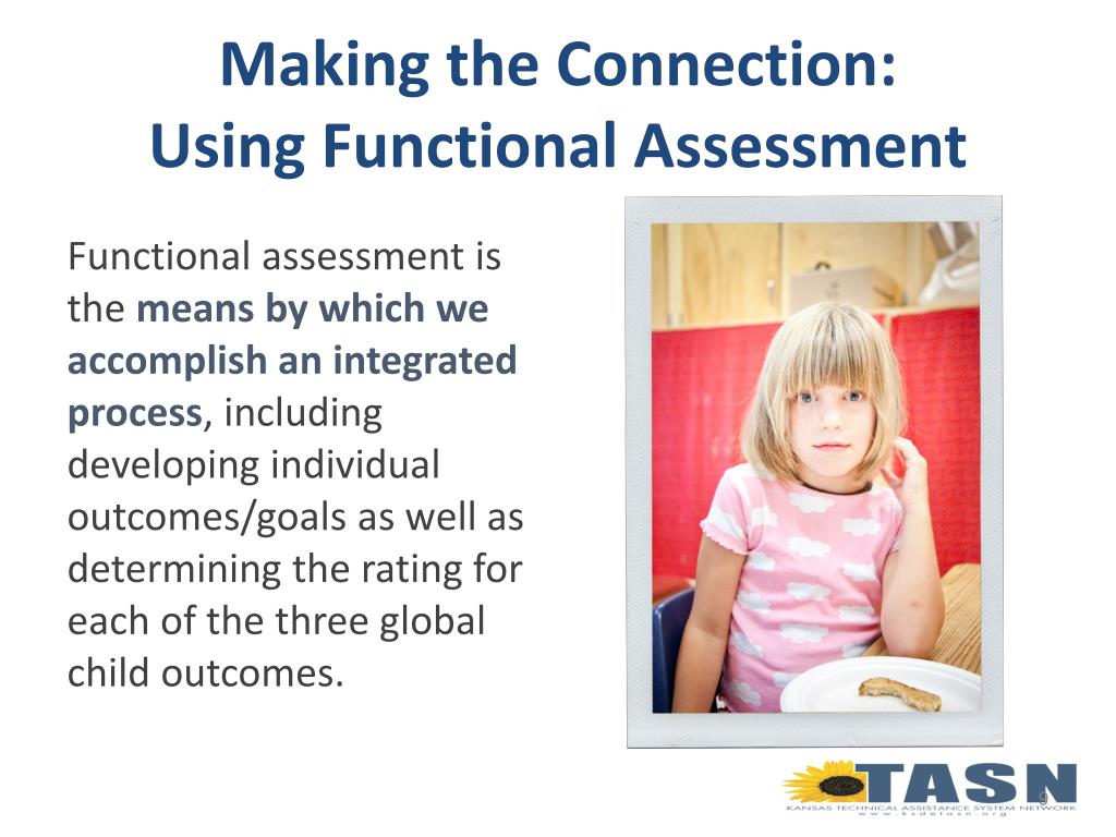 Making the Connection:Using Functional Assessment Functional assessment is the means by which we accomplish an integrated process, including developing individual outcomes/goals as well as determining the rating for each of the three global child outcomes.