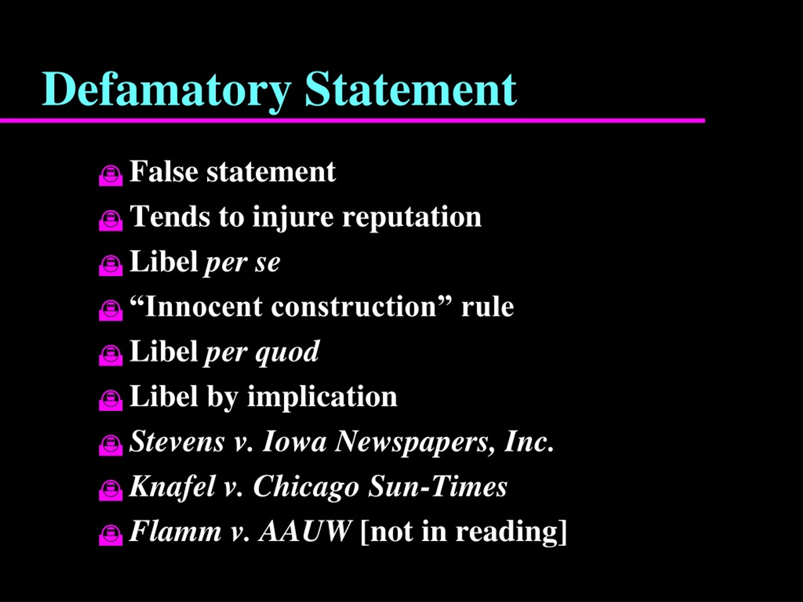 Defamatory Statement • False statement • Tends to injure reputation • Libel per se • “Innocent construction” rule • Libel per quod • Libel by implication • Stevens v. Iowa Newspapers, Inc. • Knafel v. Chicago Sun-Times • Flamm v. AAUW [not in reading]