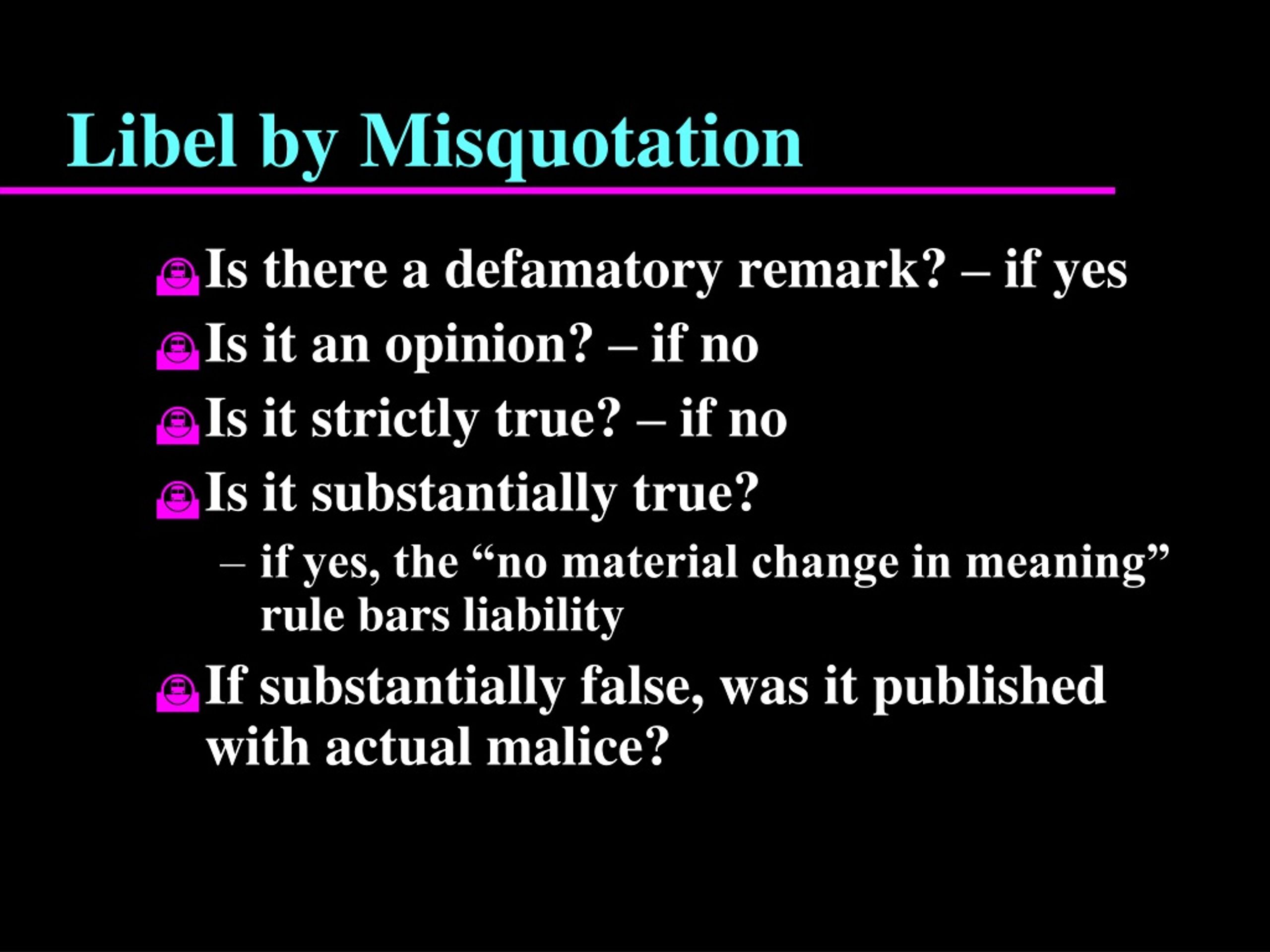 Libel by Misquotation • Is there a defamatory remark? – if yes • Is it an opinion? – if no • Is it strictly true? – if no • Is it substantially true? • if yes, the “no material change in meaning” rule bars liability • If substantially false, was it published with actual malice?