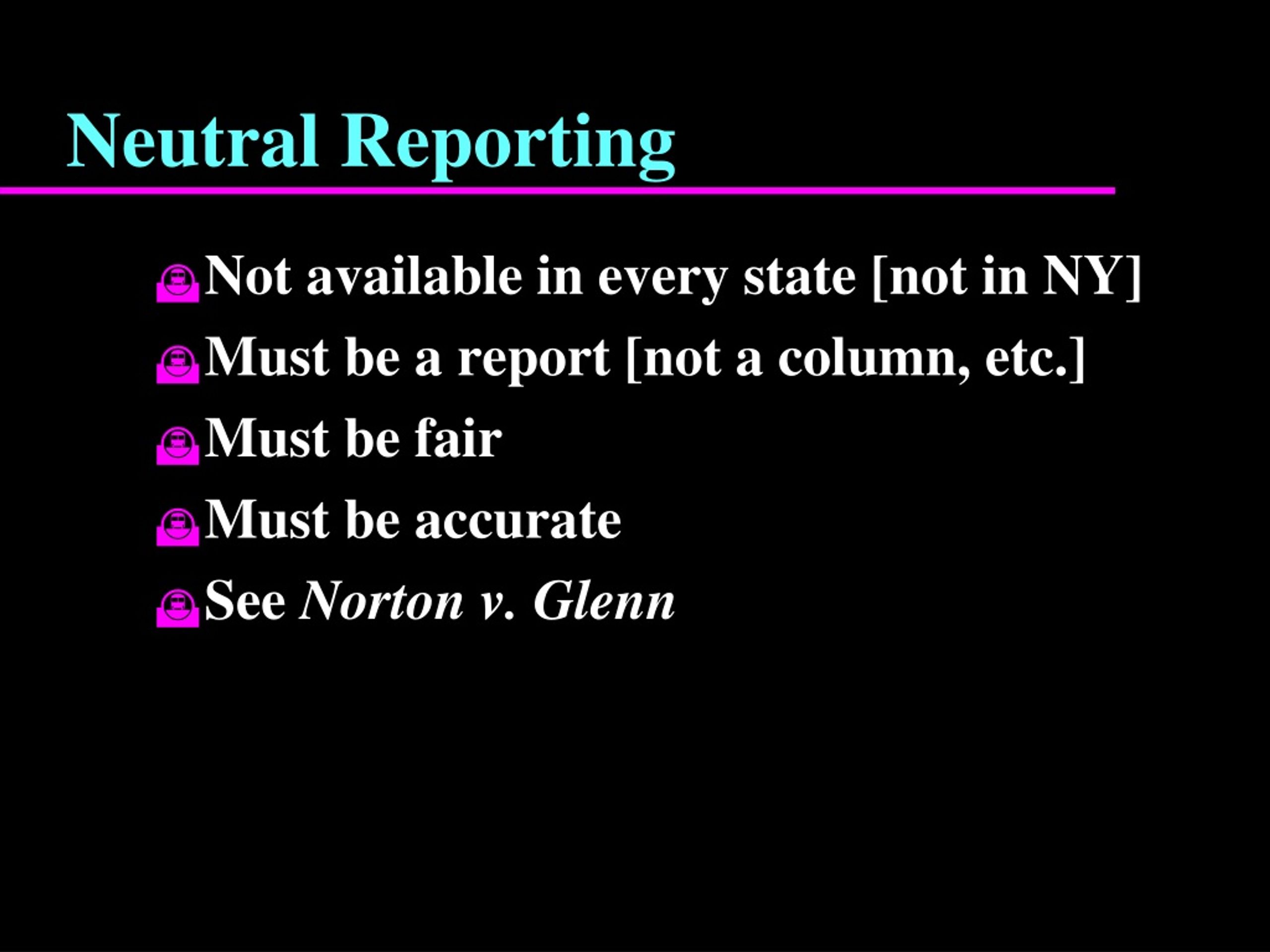 Neutral Reporting • Not available in every state [not in NY] • Must be a report [not a column, etc.] • Must be fair • Must be accurate • See Norton v. Glenn