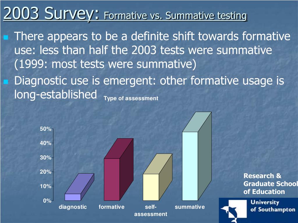 2003 Survey:Formative vs. Summative testing • There appears to be a definite shift towards formative use: less than half the 2003 tests were summative (1999: most tests were summative) • Diagnostic use is emergent: other formative usage is long-established Research & Graduate School of Education