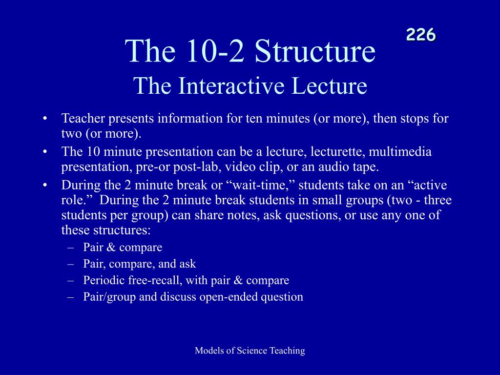 226 The 10-2 StructureThe Interactive Lecture • Teacher presents information for ten minutes (or more), then stops for two (or more). • The 10 minute presentation can be a lecture, lecturette, multimedia presentation, pre-or post-lab, video clip, or an audio tape. • During the 2 minute break or “wait-time,” students take on an “active role.” During the 2 minute break students in small groups (two - three students per group) can share notes, ask questions, or use any one of these structures: • Pair & compare • Pair, compare, and ask • Periodic free-recall, with pair & compare • Pair/group and discuss open-ended question Models of Science Teaching