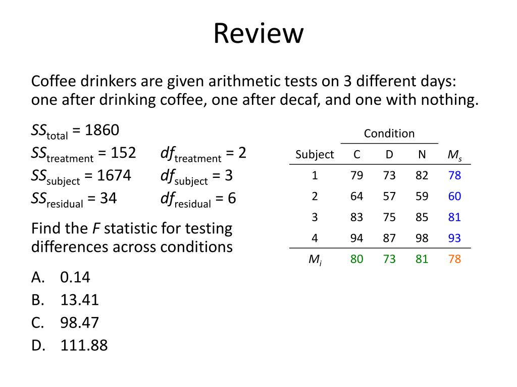 Review Coffee drinkers are given arithmetic tests on 3 different days: one after drinking coffee, one after decaf, and one with nothing. SStotal = 1860 SStreatment = 152 dftreatment = 2 SSsubject = 1674 dfsubject = 3 SSresidual = 34 dfresidual = 6 Find the F statistic for testingdifferences across conditions • 0.14 • 13.41 • 98.47 • 111.88