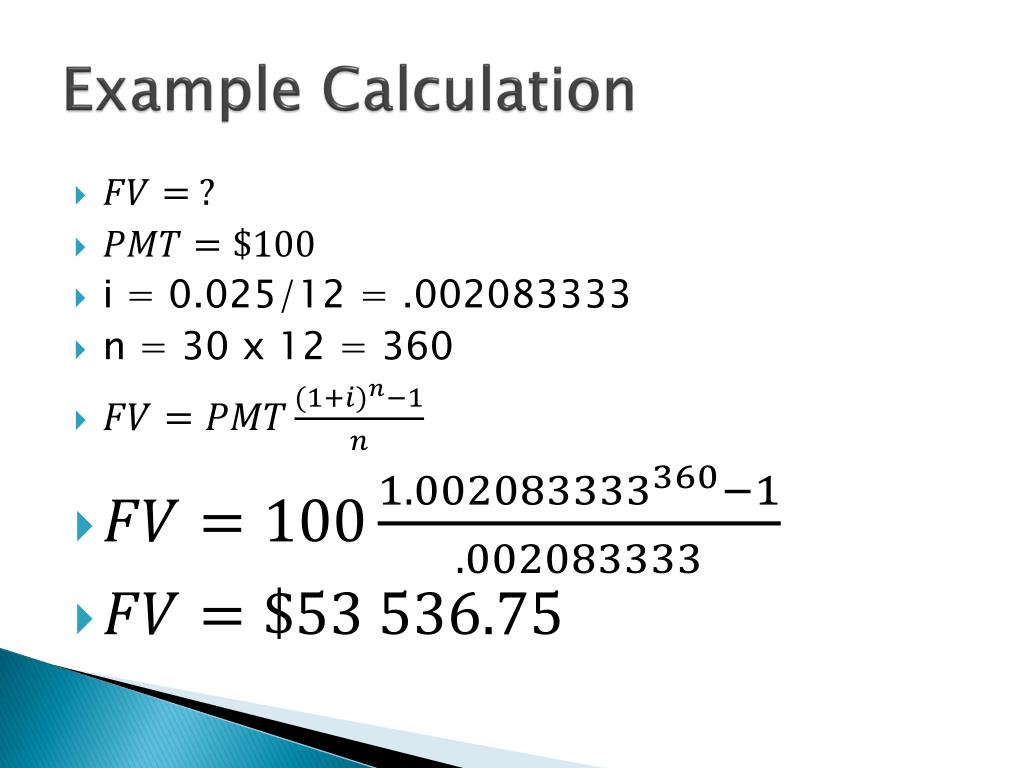 Example Calculation • i = 0.025/12 = .002083333 • n = 30 x 12 = 360