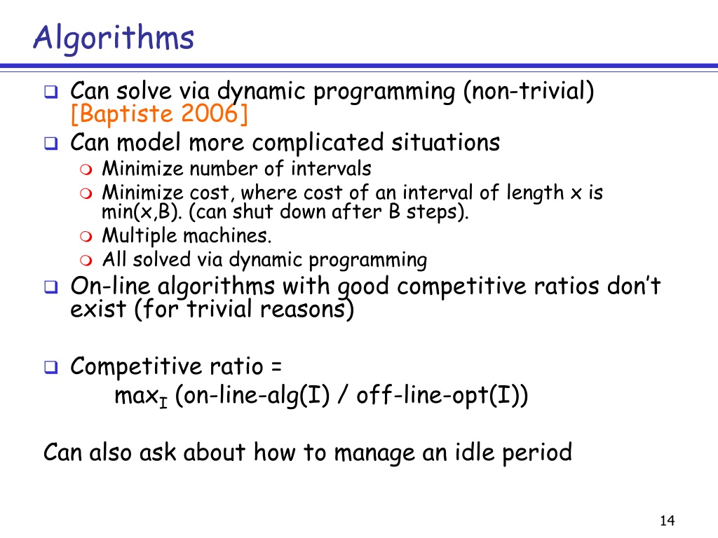 Algorithms • Can solve via dynamic programming (non-trivial) [Baptiste 2006] • Can model more complicated situations • Minimize number of intervals • Minimize cost, where cost of an interval of length x is min(x,B). (can shut down after B steps). • Multiple machines. • All solved via dynamic programming • On-line algorithms with good competitive ratios don’t exist (for trivial reasons) • Competitive ratio = maxI (on-line-alg(I) / off-line-opt(I)) Can also ask about how to manage an idle period