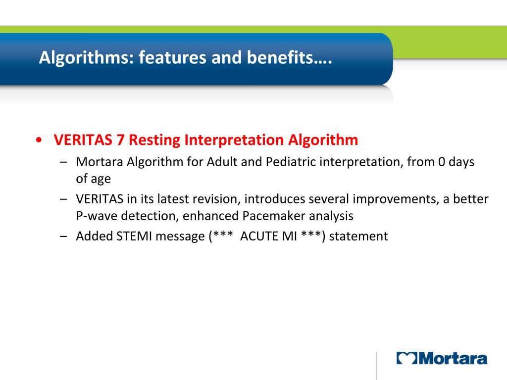 Algorithms: features and benefits…. • VERITAS 7 Resting Interpretation Algorithm • Mortara Algorithm for Adult and Pediatric interpretation, from 0 days of age • VERITAS in its latest revision, introduces several improvements, a better P-wave detection, enhanced Pacemaker analysis • Added STEMI message (*** ACUTE MI ***) statement