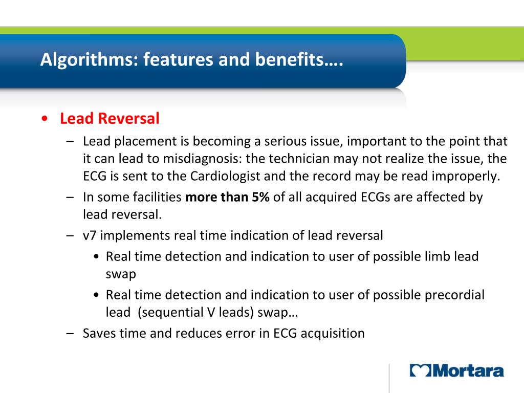 Algorithms: features and benefits…. • Lead Reversal • Lead placement is becoming a serious issue, important to the point that it can lead to misdiagnosis: the technician may not realize the issue, the ECG is sent to the Cardiologist and the record may be read improperly. • In some facilities more than 5% of all acquired ECGs are affected by lead reversal. • v7 implements real time indication of lead reversal • Real time detection and indication to user of possible limb lead swap • Real time detection and indication to user of possible precordial lead (sequential V leads) swap… • Saves time and reduces error in ECG acquisition