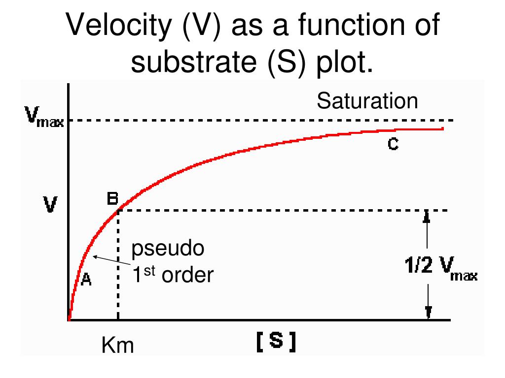 Velocity (V) as a function of substrate (S) plot. Saturation pseudo 1st order Km