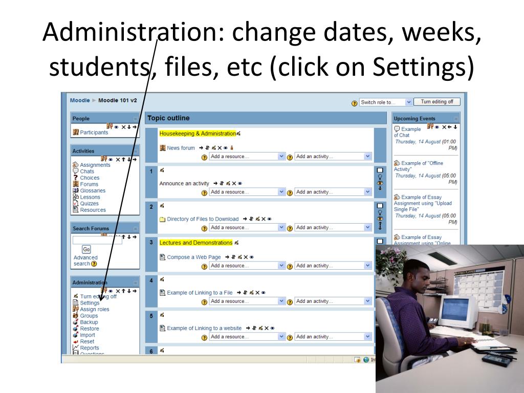 Administration: change dates, weeks, students, files, etc (click on Settings) 18