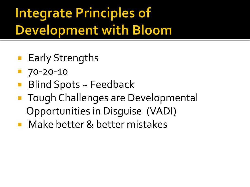 Integrate Principles of Development with Bloom • Early Strengths • 70-20-10 • Blind Spots ~ Feedback • Tough Challenges are Developmental Opportunities in Disguise (VADI) • Make better & better mistakes