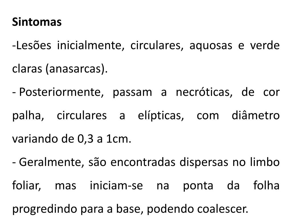 Sintomas • Lesões inicialmente, circulares, aquosas e verde claras (anasarcas). • Posteriormente, passam a necróticas, de cor palha, circulares a elípticas, com diâmetro variando de 0,3 a 1cm. • Geralmente, são encontradas dispersas no limbo foliar, mas iniciam-se na ponta da folha progredindo para a base, podendo coalescer.