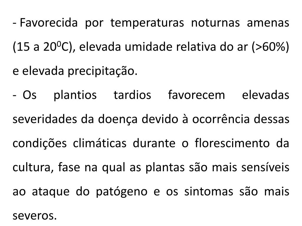 Favorecida por temperaturas noturnas amenas (15 a 200C), elevada umidade relativa do ar (>60%) e elevada precipitação. • Os plantios tardios favorecem elevadas severidades da doença devido à ocorrência dessas condições climáticas durante o florescimento da cultura, fase na qual as plantas são mais sensíveis ao ataque do patógeno e os sintomas são mais severos.