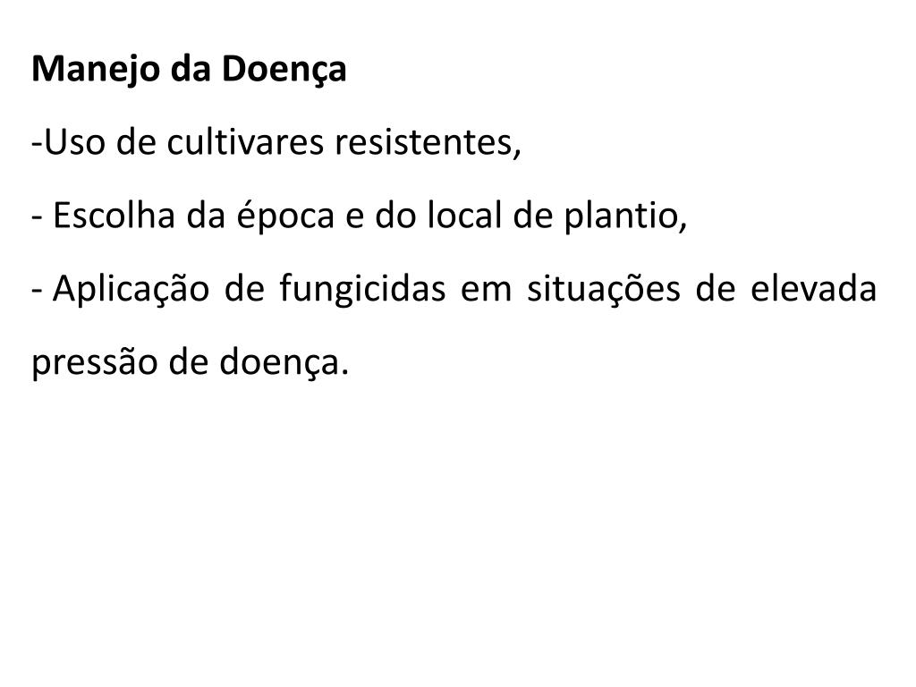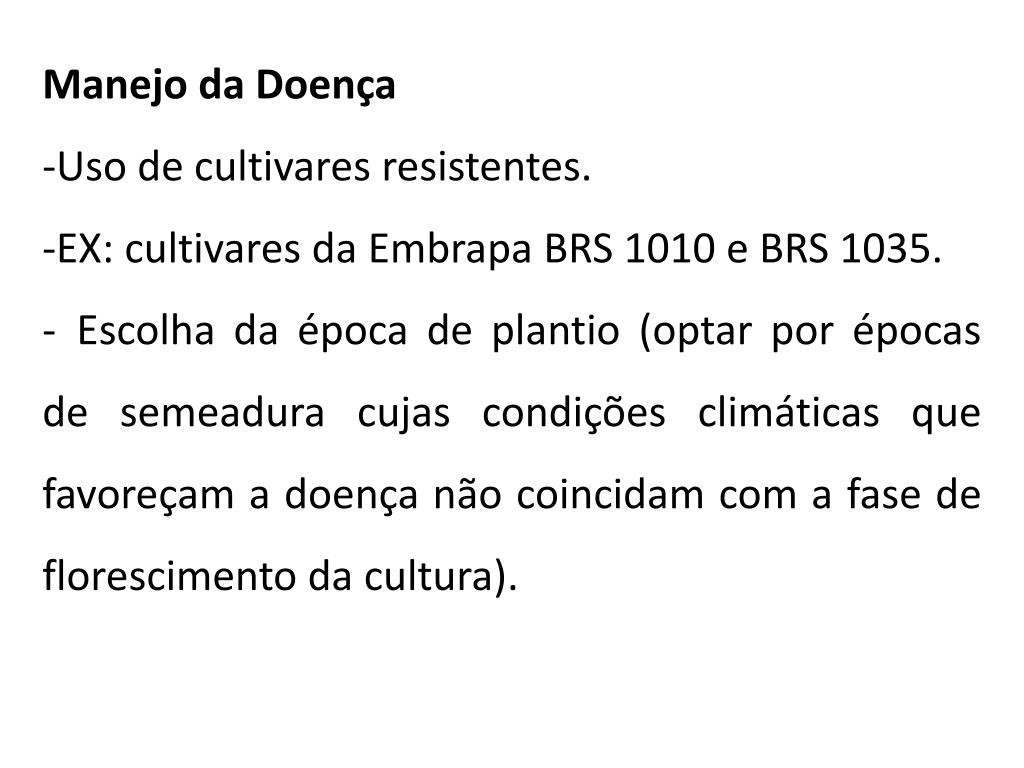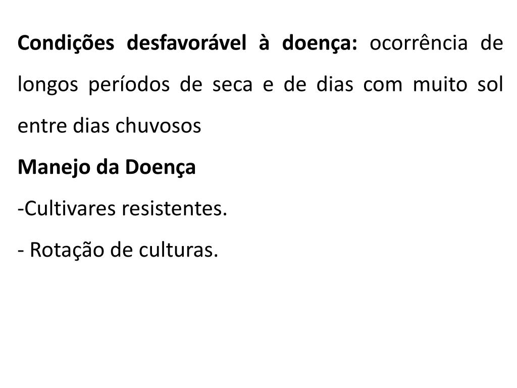 Condições desfavorável à doença: ocorrência de longos períodos de seca e de dias com muito sol entre dias chuvosos • Manejo da Doença • Cultivares resistentes. • Rotação de culturas.