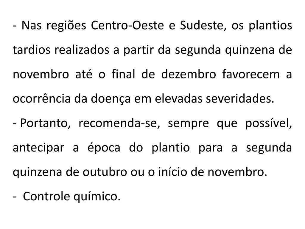 - Nas regiões Centro-Oeste e Sudeste, os plantios tardios realizados a partir da segunda quinzena de novembro até o final de dezembro favorecem a ocorrência da doença em elevadas severidades. • Portanto, recomenda-se, sempre que possível, antecipar a época do plantio para a segunda quinzena de outubro ou o início de novembro. • Controle químico.