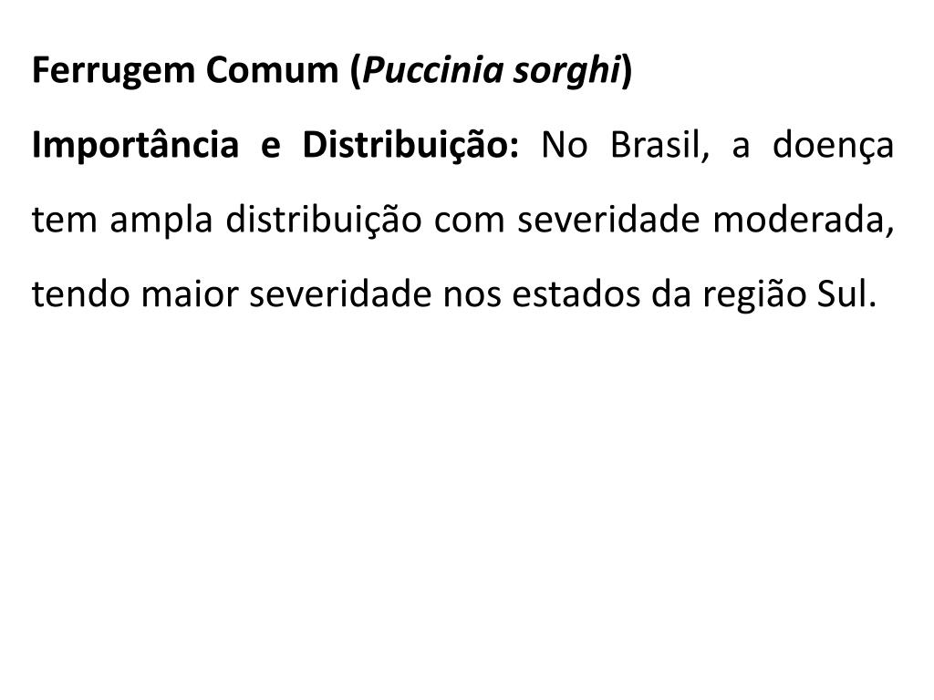Ferrugem Comum (Pucciniasorghi) Importância e Distribuição: No Brasil, a doença tem ampla distribuição com severidade moderada, tendo maior severidade nos estados da região Sul.