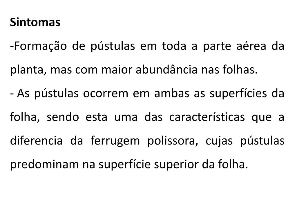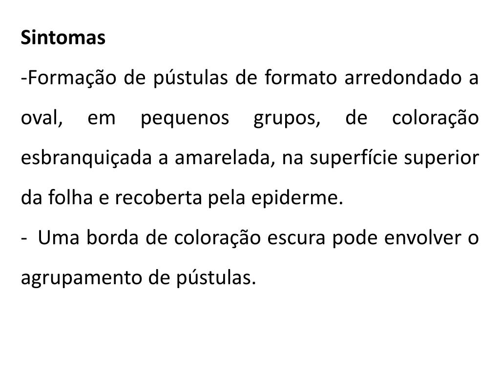Sintomas • Formação de pústulas de formato arredondado a oval, em pequenos grupos, de coloração esbranquiçada a amarelada, na superfície superior da folha e recoberta pela epiderme. • Uma borda de coloração escura pode envolver o agrupamento de pústulas.