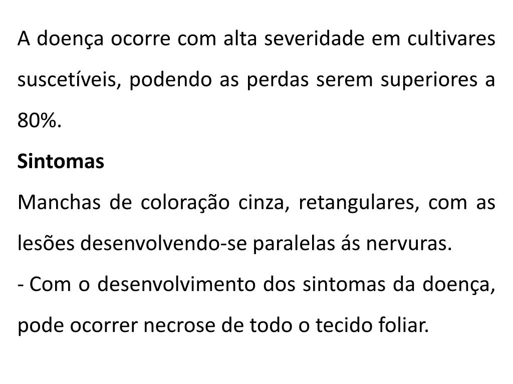 A doença ocorre com alta severidade em cultivares suscetíveis, podendo as perdas serem superiores a 80%. • Sintomas • Manchas de coloração cinza, retangulares, com as lesões desenvolvendo-se paralelas ás nervuras. • Com o desenvolvimento dos sintomas da doença, pode ocorrer necrose de todo o tecido foliar.