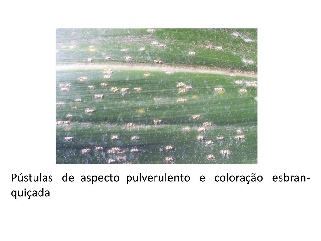 Sintomas • Formação de pústulas em toda a parte aérea da planta, mas com maior abundância nas folhas. • As pústulas ocorrem em ambas as superfícies da folha, sendo esta uma das características que a diferencia da ferrugem polissora, cujas pústulas predominam na superfície superior da folha.