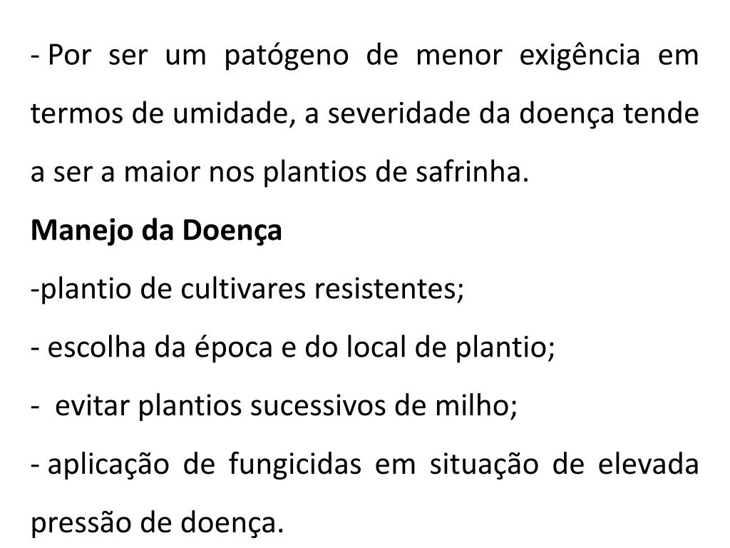 Por ser um patógeno de menor exigência em termos de umidade, a severidade da doença tende a ser a maior nos plantios de safrinha. • Manejo da Doença • plantio de cultivares resistentes; • escolha da época e do local de plantio; • evitar plantios sucessivos de milho; • aplicação de fungicidas em situação de elevada pressão de doença.