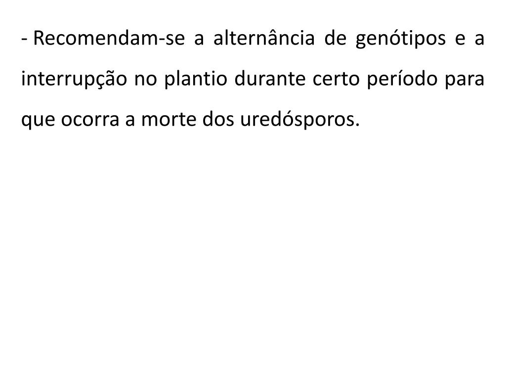 Recomendam-se a alternância de genótipos e a interrupção no plantio durante certo período para que ocorra a morte dos uredósporos.