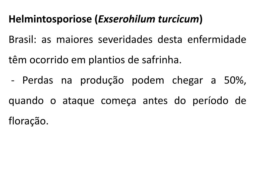 Helmintosporiose (Exserohilumturcicum) Brasil: as maiores severidades desta enfermidade têm ocorrido em plantios de safrinha. - Perdas na produção podem chegar a 50%, quando o ataque começa antes do período de floração.