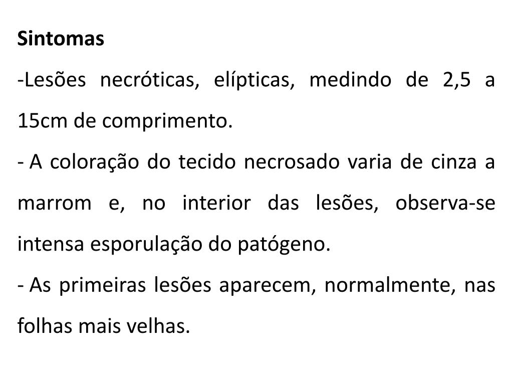 Sintomas • Lesões necróticas, elípticas, medindo de 2,5 a 15cm de comprimento. • A coloração do tecido necrosado varia de cinza a marrom e, no interior das lesões, observa-se intensa esporulação do patógeno. • As primeiras lesões aparecem, normalmente, nas folhas mais velhas.