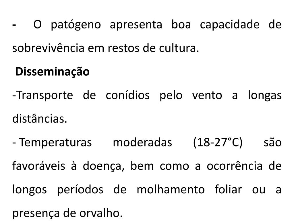 - O patógeno apresenta boa capacidade de sobrevivência em restos de cultura. • Disseminação • Transporte de conídios pelo vento a longas distâncias. • Temperaturas moderadas (18-27°C) são favoráveis à doença, bem como a ocorrência de longos períodos de molhamento foliar ou a presença de orvalho.