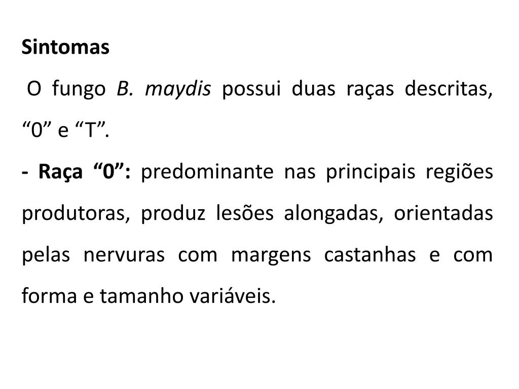 Sintomas O fungo B. maydis possui duas raças descritas, “0” e “T”. - Raça “0”: predominante nas principais regiões produtoras, produz lesões alongadas, orientadas pelas nervuras com margens castanhas e com forma e tamanho variáveis.
