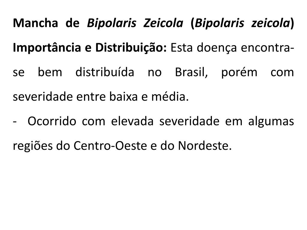 Mancha de Bipolarismaydis (Bipolarismaydis )Importância e Distribuição: Esta doença encontra-se bem distribuída no Brasil, porém com severidade entre baixa e média. - Atualmente, em algumas áreas das regiões Centro-Oeste e Nordeste, tem ocorrido com elevada severidade em materiais suscetíveis.