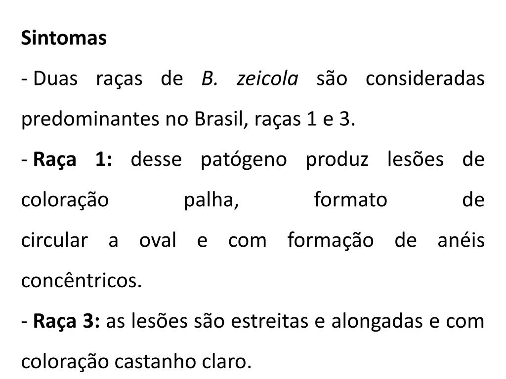 Sintomas • Duas raças de B. zeicola são consideradas predominantes no Brasil, raças 1 e 3. • Raça 1: desse patógeno produz lesões de coloração palha, formato decircular a oval e com formação de anéis concêntricos. • Raça 3: as lesões são estreitas e alongadas e com coloração castanho claro.